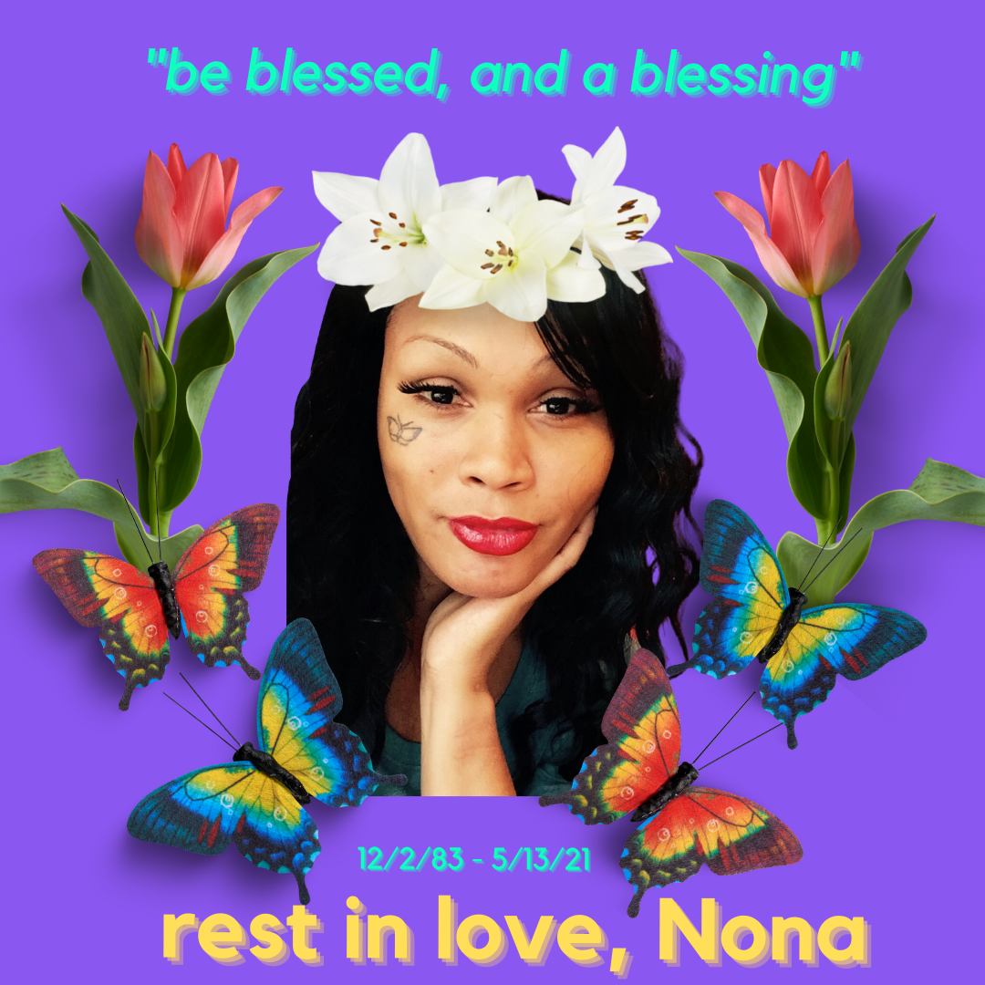She gave endlessly and without hesitation, always reminding us to “be blessed, and a blessing,” because she believed deeply in giving back to her community of Black trans women and sex workers. Though she would sometimes get nervous, she loved speaking out in public against the violence Black trans women faced, and frequently uplifted the humanity of sex workers and interrogated the ways state violence interrupted the livelihood of her people. Nona was a compelling and irreplaceable force that illuminated each space she entered.