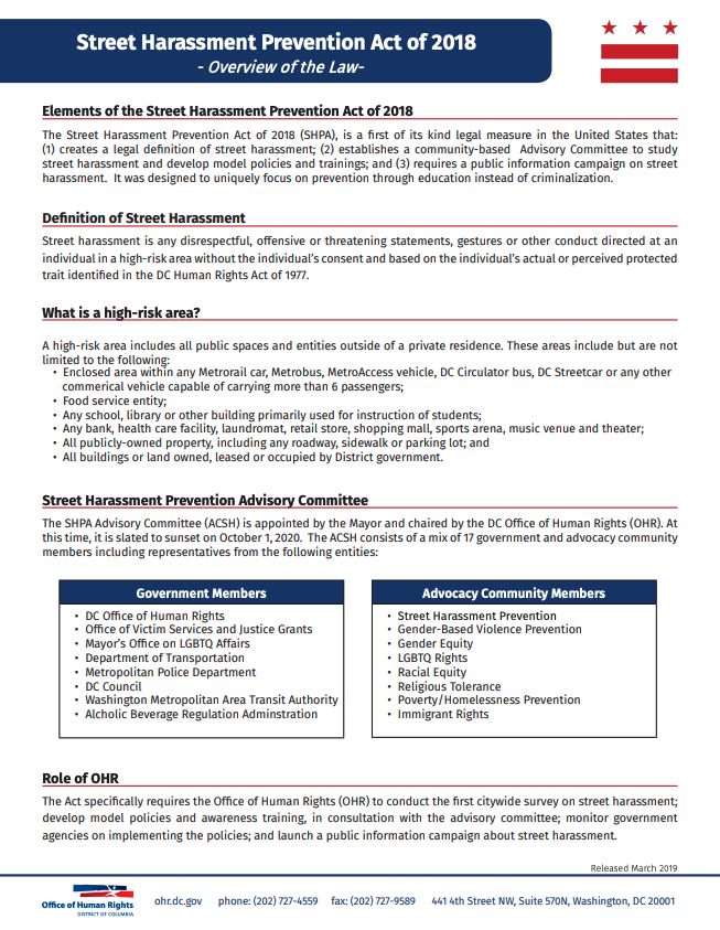 The Street Harassment Prevention Act created an advisory committee on street harassment that would propose policies and/or training materials to be implemented in District agencies; require the DC Office of Human Rights (OHR) to both conduct a citywide survey on street harassment and implement a public information campaign regarding street harassment.