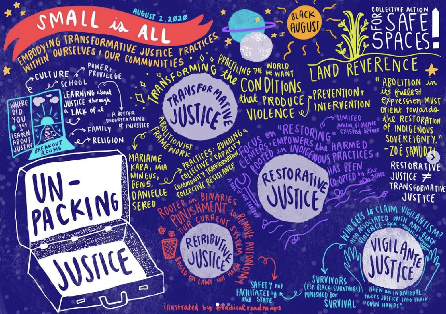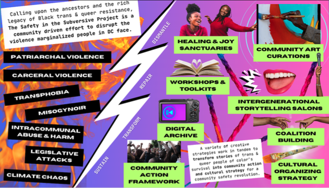 The Safety in the Subversive Project aimed to usher in a cultural shift towards more communities taking collective action to keep each other safe without replicating the state. The program was designed to interrogate the current era of individualism, late stage capitalism, and widespread fascism that has produced widespread anti-Blackness, transphobia, interpersonal harm, and patriarchal violence towards marginalized people of color. The project wanted to revive unique models of care, communalism, and safety; in an effort to provide a more visible answer to the “how” of community-driven alternatives to the carceral state.