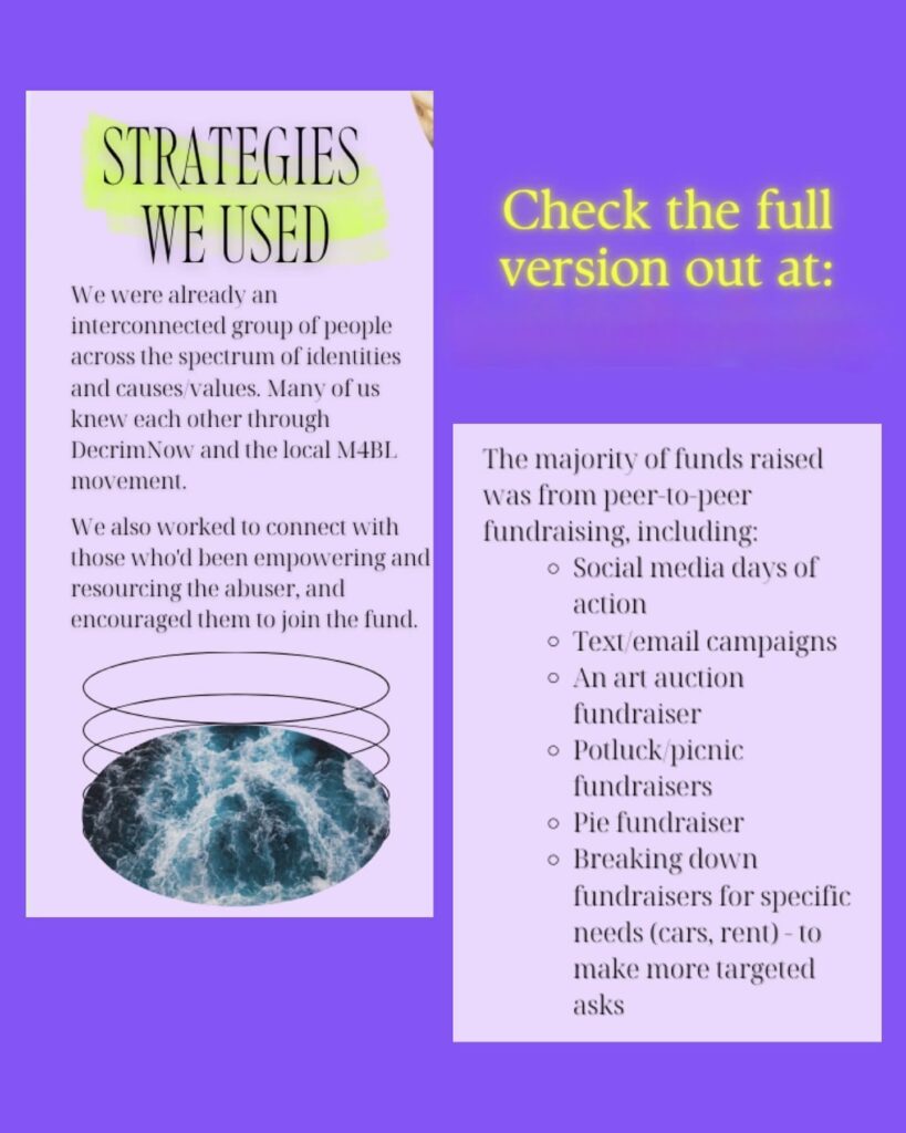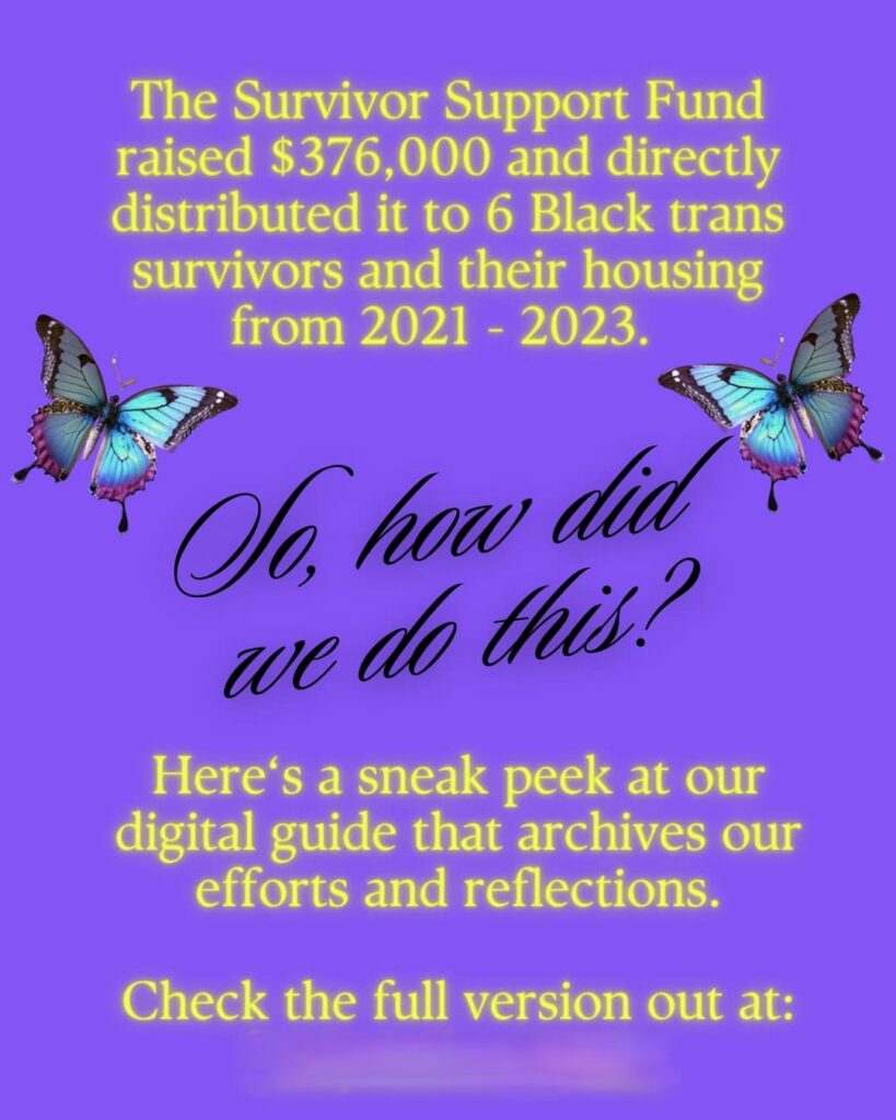 The Survivor Support Fund raised almost $400,000,000. The funds went directly to 6 Black trans survivors over a two year period through monthly cash distributions, rent payments, car payments, legal support, and a fellowship program.